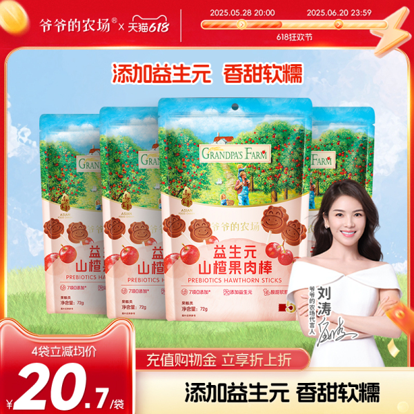 山楂棒4袋装,拍1,143.6-48(立减)-17(劵)=78.6,均价19.7,叠加淘金币74.3,均价18.6(赠送每日酸奶1袋)爷爷的农场山楂棒宝宝零食儿童水果条益生元山楂棒棒糖不加白砂糖。