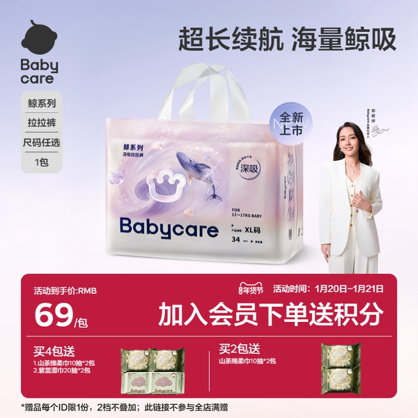 到手56.03【页面价99-限时直降30-右上角领淘金币2.97-首单礼金10】,叠消费券后49.03!babycare鲸拉拉裤采用“海量鲸吸”芯体结构,瞬吸锁水,有效减少反渗,保持宝宝屁屁整日干爽。超薄设计贴合身形,轻盈无负担,搭配高弹腰围与透气底膜,提升穿着舒适度与活动自由度。深吸裤型贴合防漏,适合活泼好动的宝宝日常使用。大容量吸收力配合柔软亲肤表层,兼顾性能与舒适,是妈妈们安心之选。